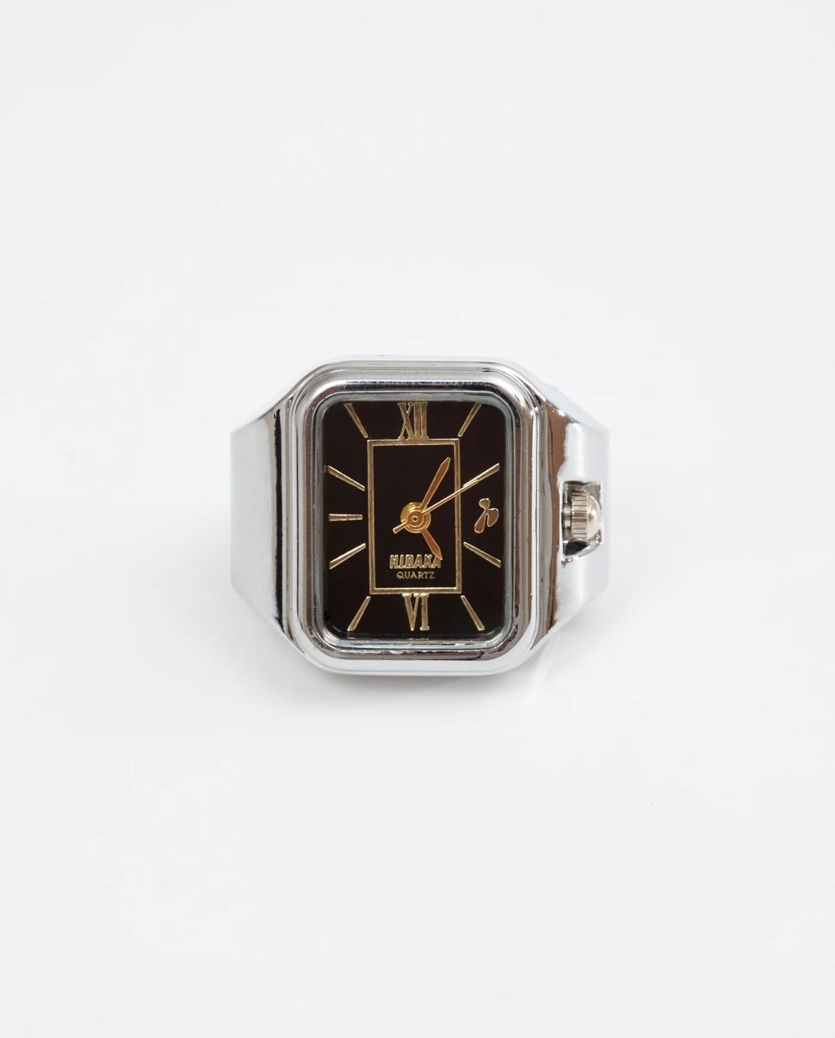 クラシックな意匠のヴィンテージウォッチをサンプリングしてデザインしたリングウォッチ。指につける時計という新しい形態で実用性と装飾性の境界を探った新しいジュエリーです。縮小されたデザインは機能的でありながらもシュールで日常の中に存在感を放ちます。伸縮性のベルトで11号〜20号程度まで指に合わせて装着可能です。