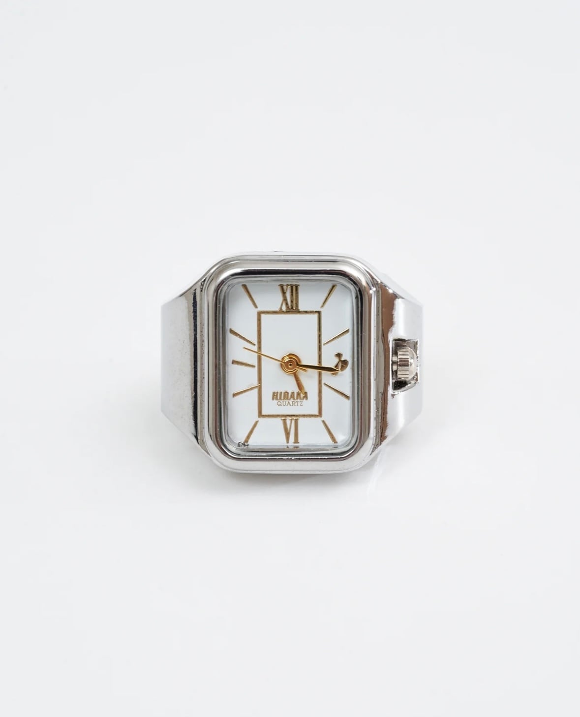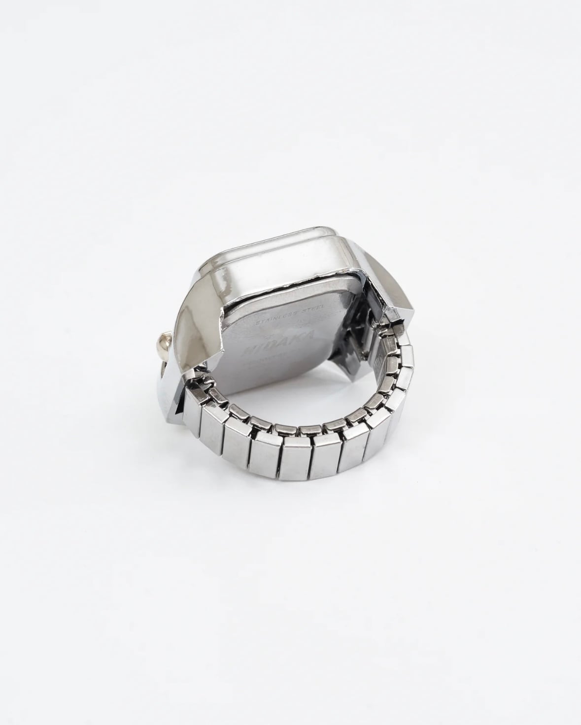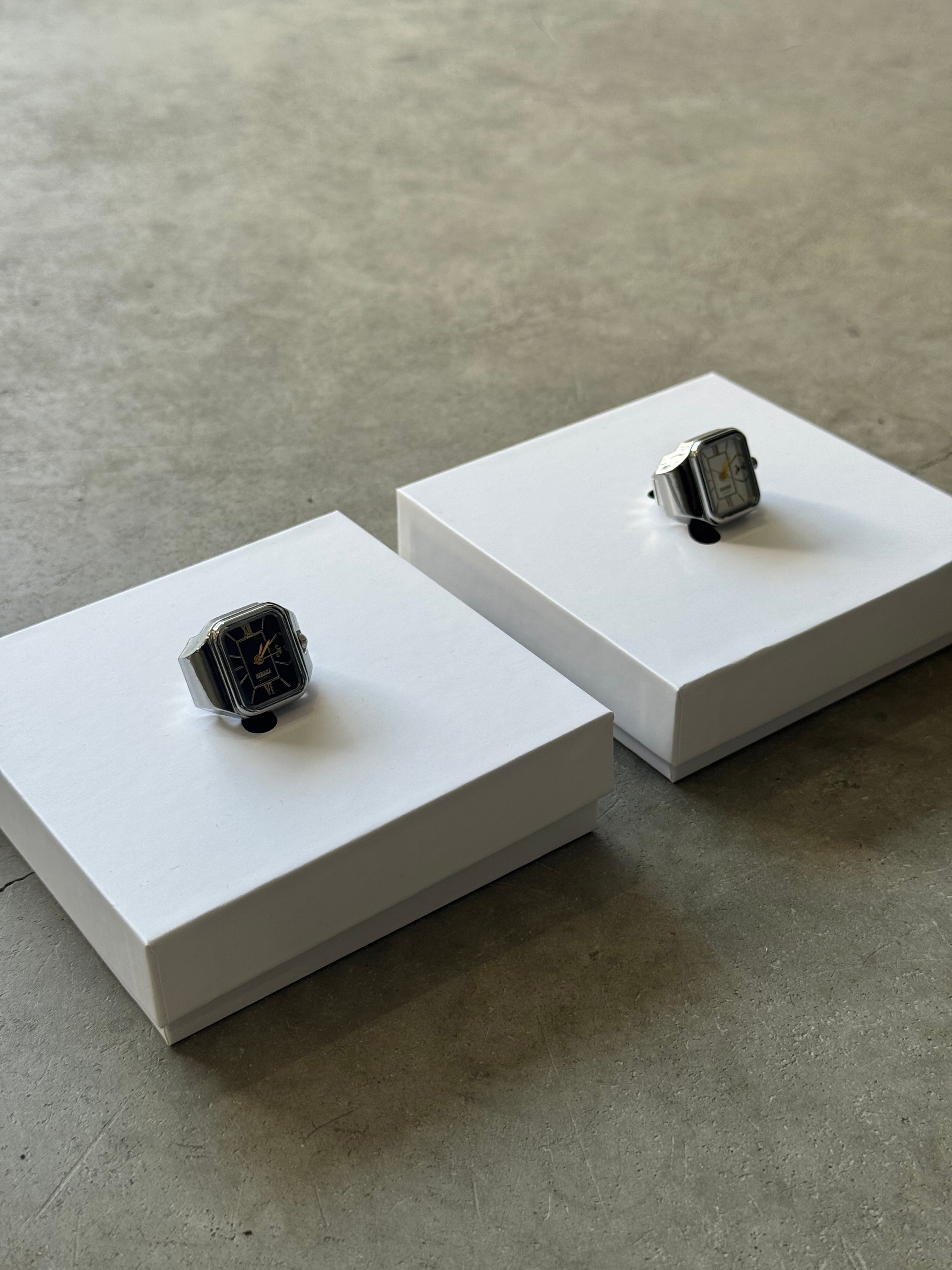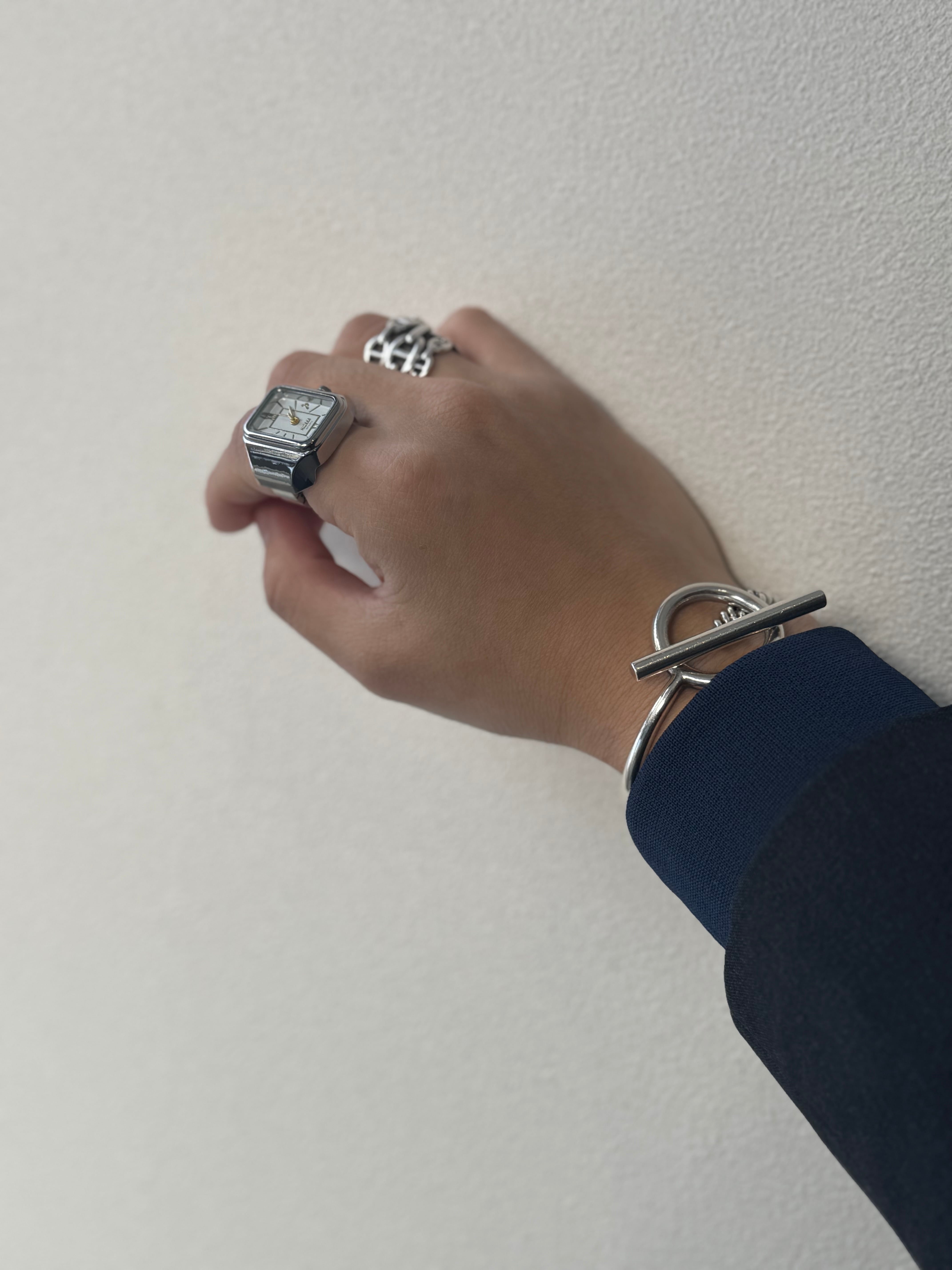 クラシックな意匠のヴィンテージウォッチをサンプリングしてデザインしたリングウォッチ。指につける時計という新しい形態で実用性と装飾性の境界を探った新しいジュエリーです。縮小されたデザインは機能的でありながらもシュールで日常の中に存在感を放ちます。伸縮性のベルトで11号〜20号程度まで指に合わせて装着可能です。