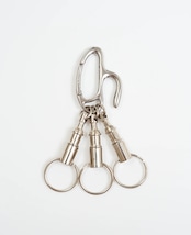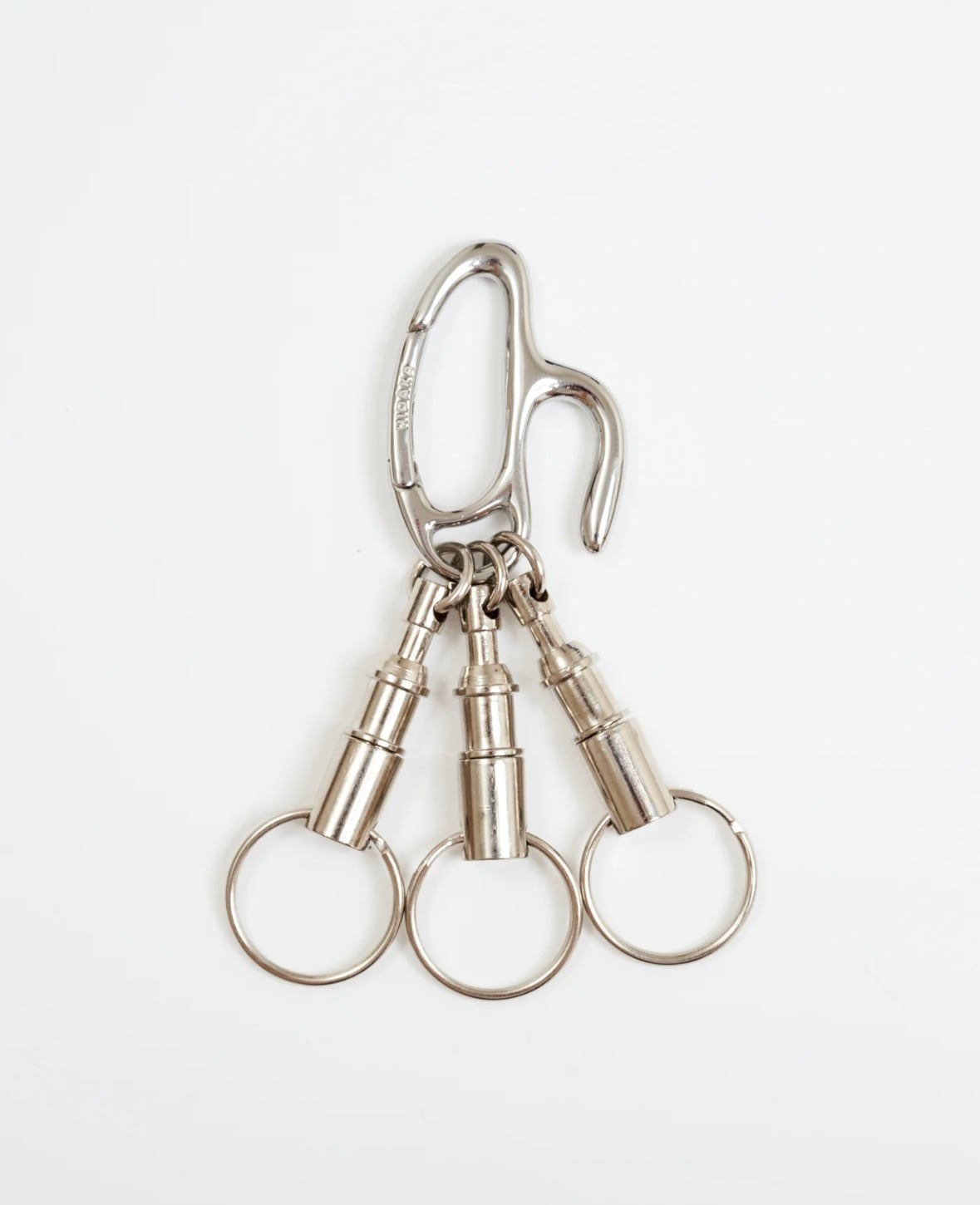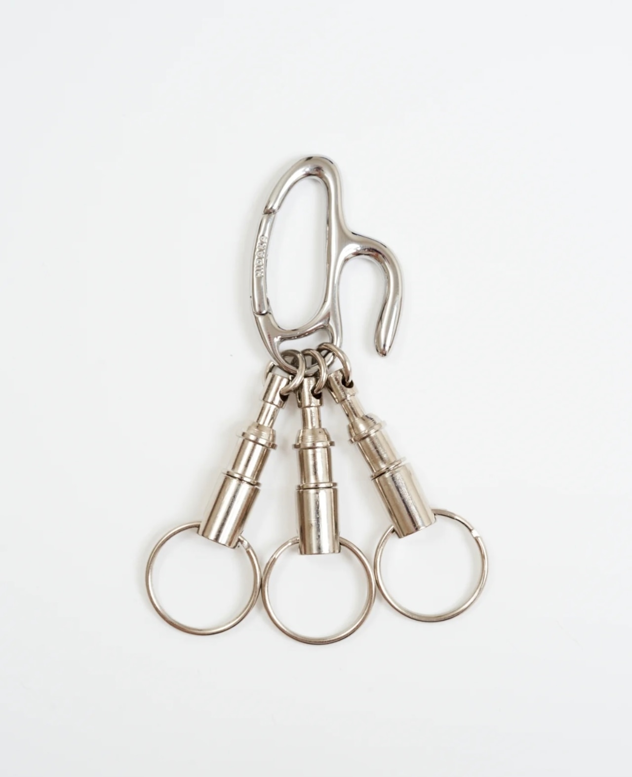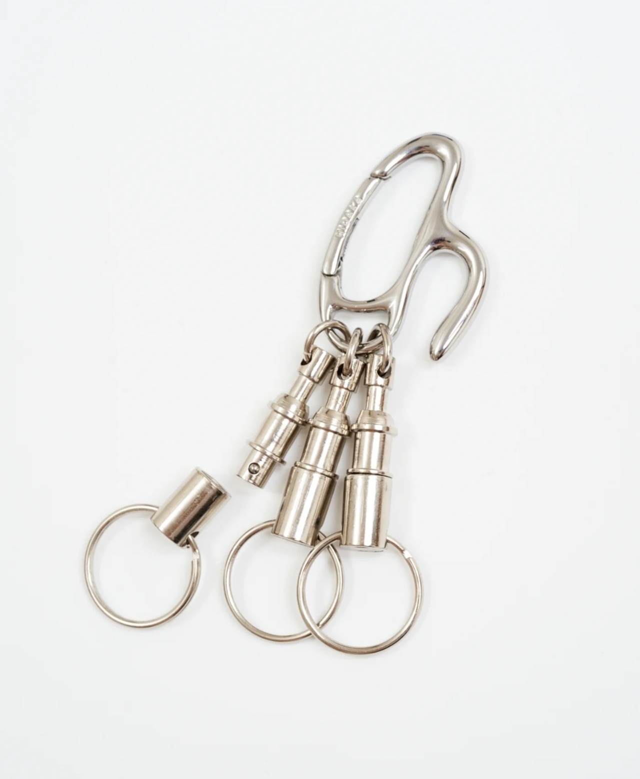 カラビナの先端に3つのキーリリースが付属した定番キーチェーン。キーリリースの突起を軽く押して引き抜くことで外れる仕組みになっており、1点ずつクイックに取り外しが可能。キーリリースが3つ付属しているため、エンジンキーとトランクキー、玄関キーのように3種類のキーをまとめて持ち歩け、必要に応じて別々に機能させることができるデイリーユースなアイテムです。