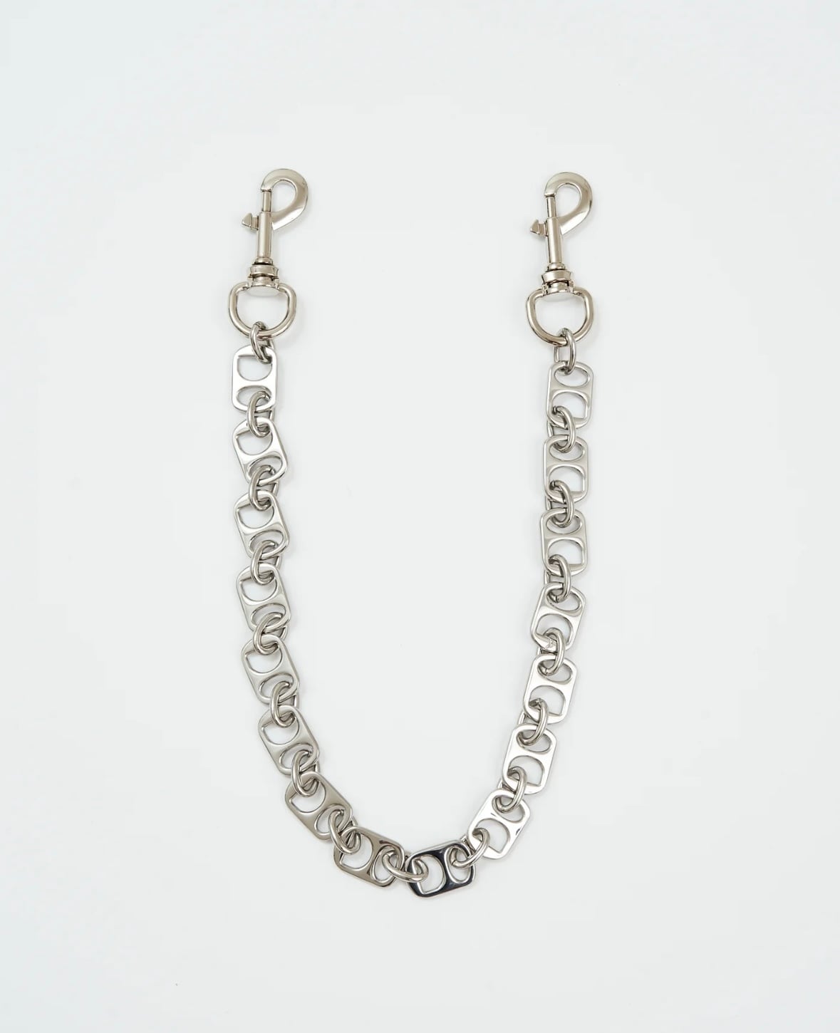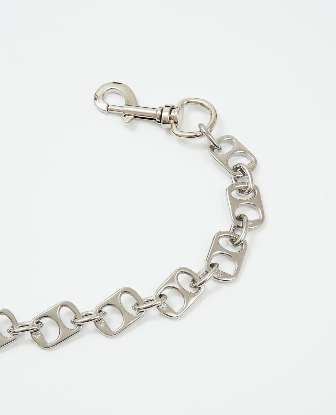 缶のプルタブをモチーフにしたパンツチェーン兼ネックレス。消費される日常の一部をジュエリーとして再構築し、型から制作したオリジナルパーツで丁寧に仕上げました。レディメイド的な発想がもたらすユニークなデザインは、既知の中に潜む新たな可能性を引き出します。
