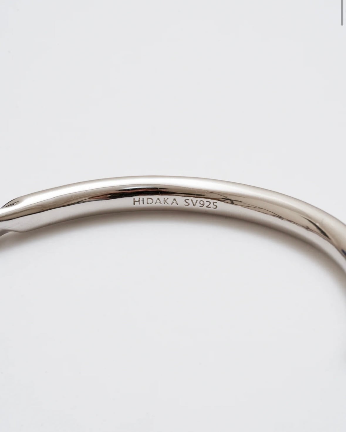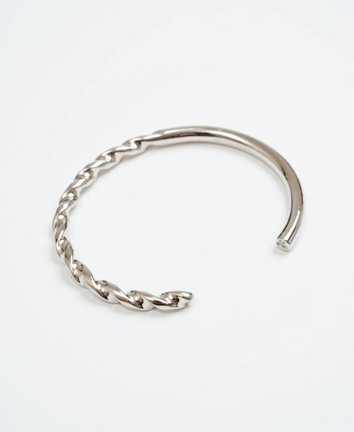 X線没収品を再解釈する〈Confiscation Objects〉シリーズから、工具のスパイラル刃 “ドリルビット” をモチーフにしたSV925製バングル。線径5mmのバーに螺旋溝を彫刻し、エッジを残したまま全面を鏡面仕上げでポリッシュ。光が溝に沿って流れ、実際のビットが金属をえぐる瞬間の動きを再現します。
